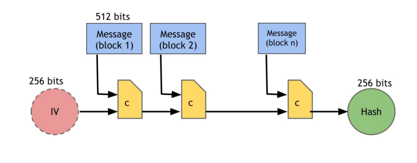 The headache with the algorithm is that the length must be included. An 8-byte big-endian 64-bit integer with the exact number of bits in the message. A running byte count should be maintained. Padding begins with a header marker of a single “1” bit (0x80 in byte parlance) and follows with “0” bits to align the bit-length long-word at the end of a 512-bit block. If the 9-byte suffix won’t fit in the current block (p=0.140625), place the header marker and zero to the end of the block. Remember that the header marker is placed.